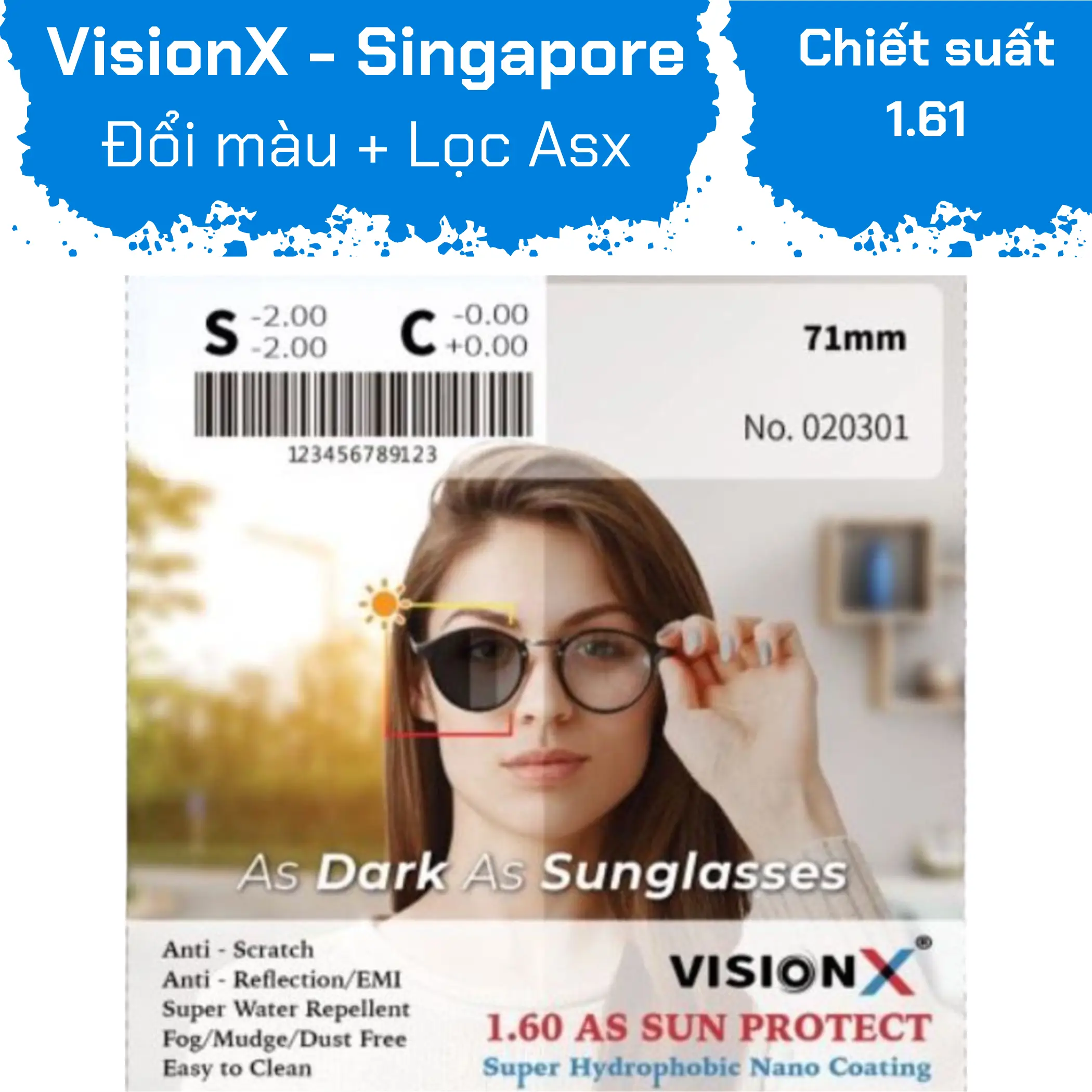 Sử dụng công nghệ tiên tiến, tròng kính Vision X được thiết kế để đổi màu từ trong suốt sang xám khói khi tiếp xúc với ánh sáng mặt trời. Khả năng này giúp bảo vệ mắt khỏi ánh sáng chói và tia UV có hại. Hơn thế nữa, tròng kính còn được tráng cứng bề mặt, chống bám bẩn và dầu, giúp việc vệ sinh trở nên dễ dàng hơn. Công nghệ UV470 và chống ánh sáng xanh mang lại sự bảo vệ tối ưu cho đôi mắt khỏi những tác nhân gây hại thường gặp.