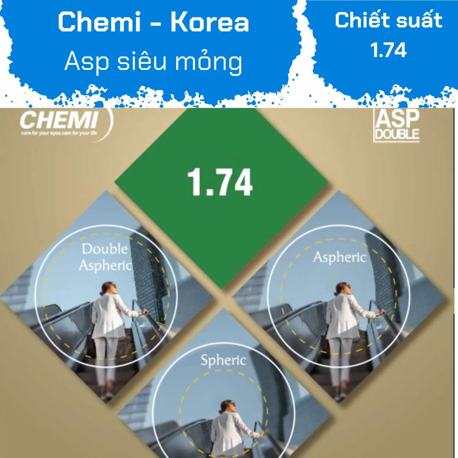 Double Aspheric Lens – Chemi Double Aspheric 1.74 is a premium product from the Chemi brand, catering to the needs of those with complex refractive errors. Designed with advanced technology, this lens not only provides a sharp visual experience but also ensures comfort and ease for users throughout the wearing process. With a high refractive index of 1.74, the lens is extremely thin and lightweight, suitable for those who desire elegance and aesthetics when wearing glasses.