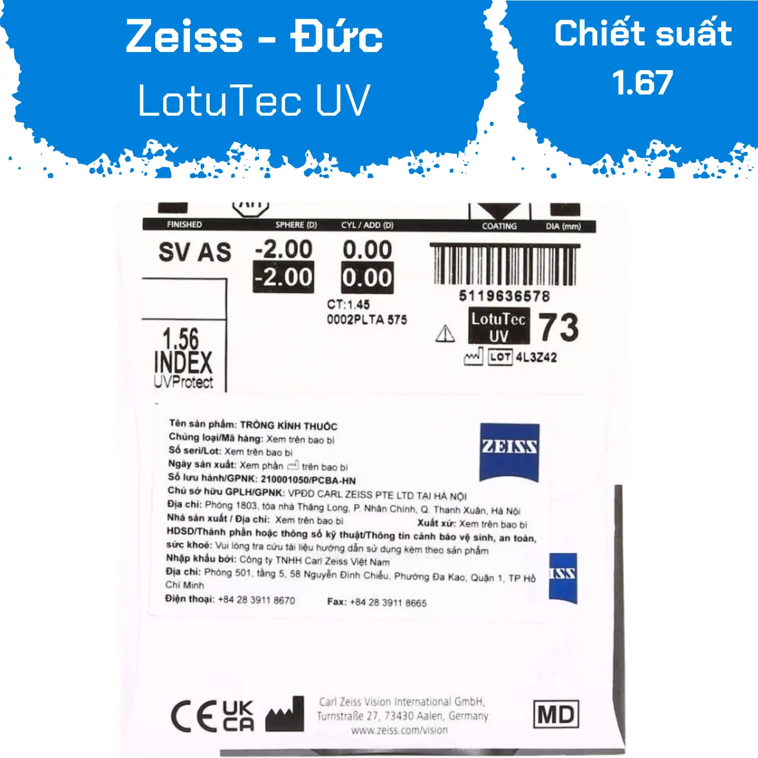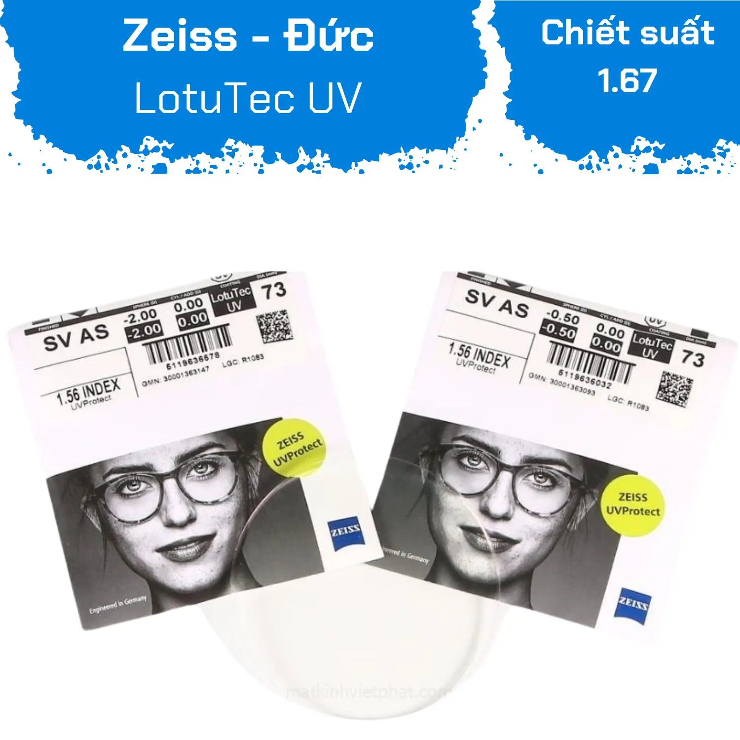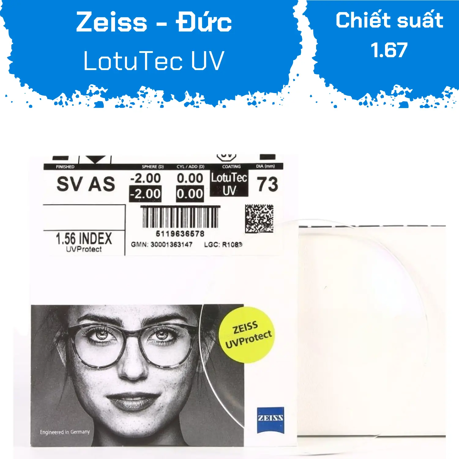 The Zeiss LotuTec UV 1.67 lenses are a premium product from the brand Kính, featuring the most advanced technology from Germany. With a super thin design and superior dirt/oil resistance, this product not only provides comfort but also meets today's fashion needs. It is the perfect choice for those seeking a combination of quality and aesthetics.