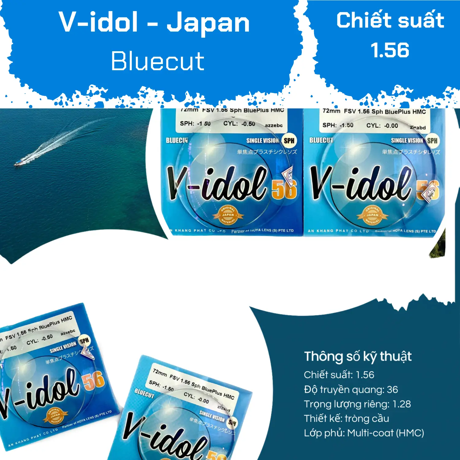 The V-idol 1.56 Bluecut lenses are manufactured using advanced technology from Hoya - Japan, ensuring top quality in the eyewear industry. The product is equipped with a Multi-coat (HMC) coating, which not only enhances durability but also improves scratch resistance. Thanks to this coating, the lenses have a shiny surface, improving optical performance and extending their lifespan.