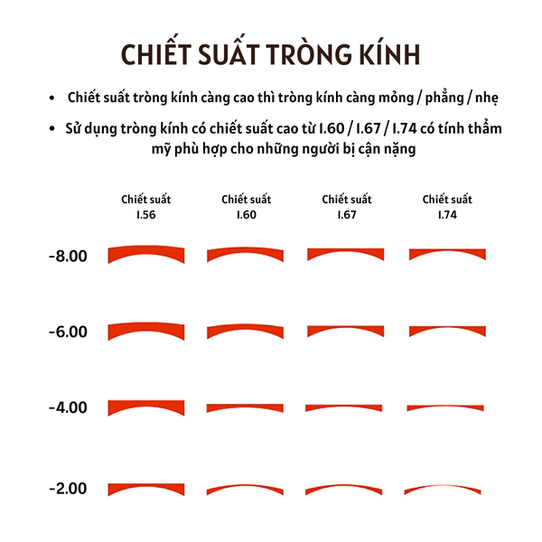 - Thương hiệu: Vis Care- Xuất xứ: Singapore- Chiết suất: 1.58- Màu sắc: Trong suốt- Thể loại: Chống ánh sáng xanhTÍNH NĂNG NỔI BẬT CỦA TRÒNG KÍNH- Chống ánh sáng xanh 100% có hại từ các thiết bị điện tử, điện thoại, máy tính,...- Mỏng nhẹ 15%- Bảo vệ mắt khỏi tia UV- Hạn chế chói tối ưu- Chống bám bụi bẩn- Chống bám vân tay- Chống bám hơi nước- Hạn chế trầy xước- Dễ dàng lau chùi giúp bạn thoải mái trong các hoạt động hằng ngàyTHÔNG TIN THÊM VỀ CHIẾT SUẤT- Chiết suất thông dụng 1.56- Chiết suất cao 1.60 (Mỏng hơn 15%)- Chiết suất cao 1.67 (Mỏng hơn 25%)- Chiết suất cao 1.74 (Mỏng hơn 35%) so với tròng 1.56 thông thường- Chiết suất cao có vùng nhìn rộng hơn, ít quang sai hơn- Phù hợp với nhiều mẫu gọng thời trang đa dạng phong cách cho bạn- Chống ánh sáng xanh tím có hại, giảm căng thẳng mỏi mắt, khô mắt, hạn chế tăng độ.- Gắn được trên mọi loại gọng kính, kể cả kính khoan ốc- Chống bể vỡ tối ưu nhất