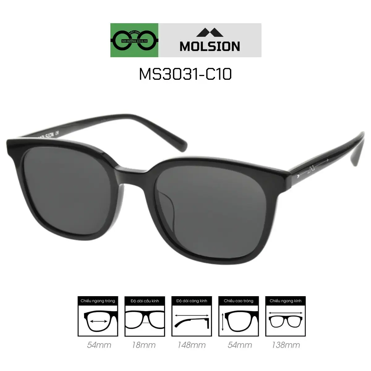 A: Kính Molsion MS3031-C10 sử dụng chất liệu acetate cao cấp cùng với công nghệ E-SPF độc quyền, mang lại sự bảo vệ tối đa cho mắt khỏi tia UV cũng như sự thoải mái khi đeo.