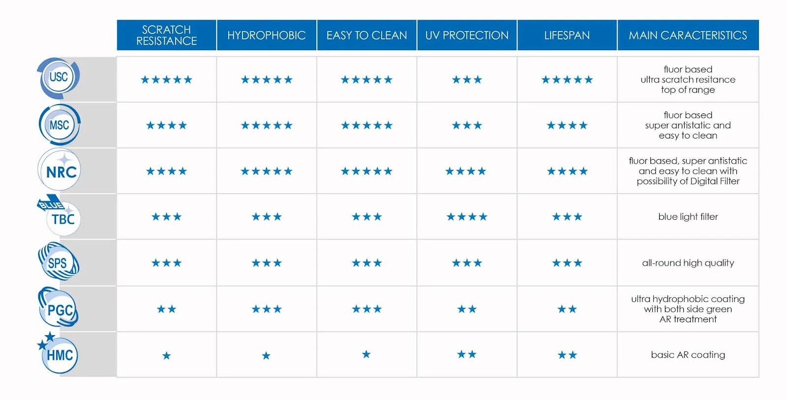- Tokai có nhiều loại lớp phủ được phát triển thông qua công nghệ thấu kính mới nhất có thể đáp ứng các yêu cầu khác nhau của khách hàng. Kiến thức và kinh nghiệm này đã dẫn đến việc tạo ra hơn 20 lớp phủ thấu kính nhãn khoa. Dưới đây là tổng quan về các đặc tính của lớp phủ chính:
